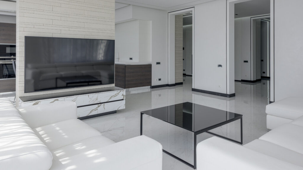 曲線すら排除した完全な直線や幾何学的な形が特徴です。ガラスやステンレスといった無機質な素材を多用し、あえて「生活感」を徹底的に排除した近未来的なイメージ。