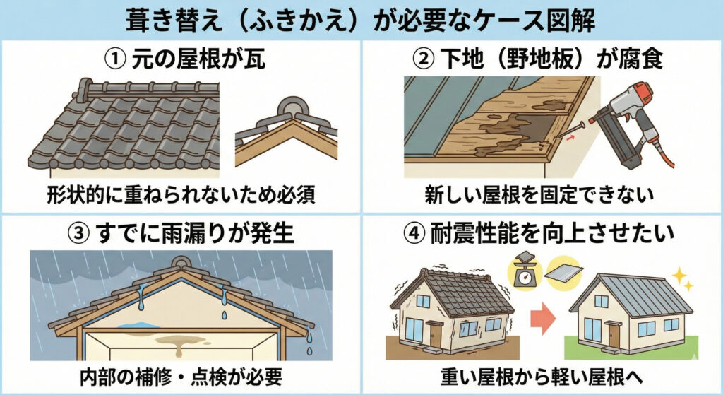 元の屋根が瓦」の場合は、形状的に上から重ねることができないため、葺き替えが必須となります。⚠️