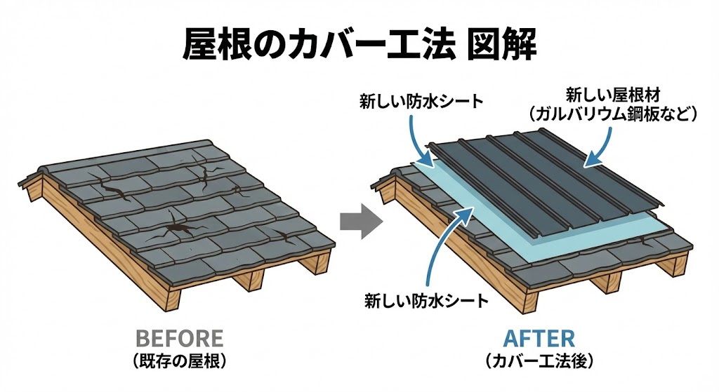 • メリット: 今の屋根を剥がさないため、廃材(ゴミ)が出ず、コストを抑えて工期も短縮できます。💰