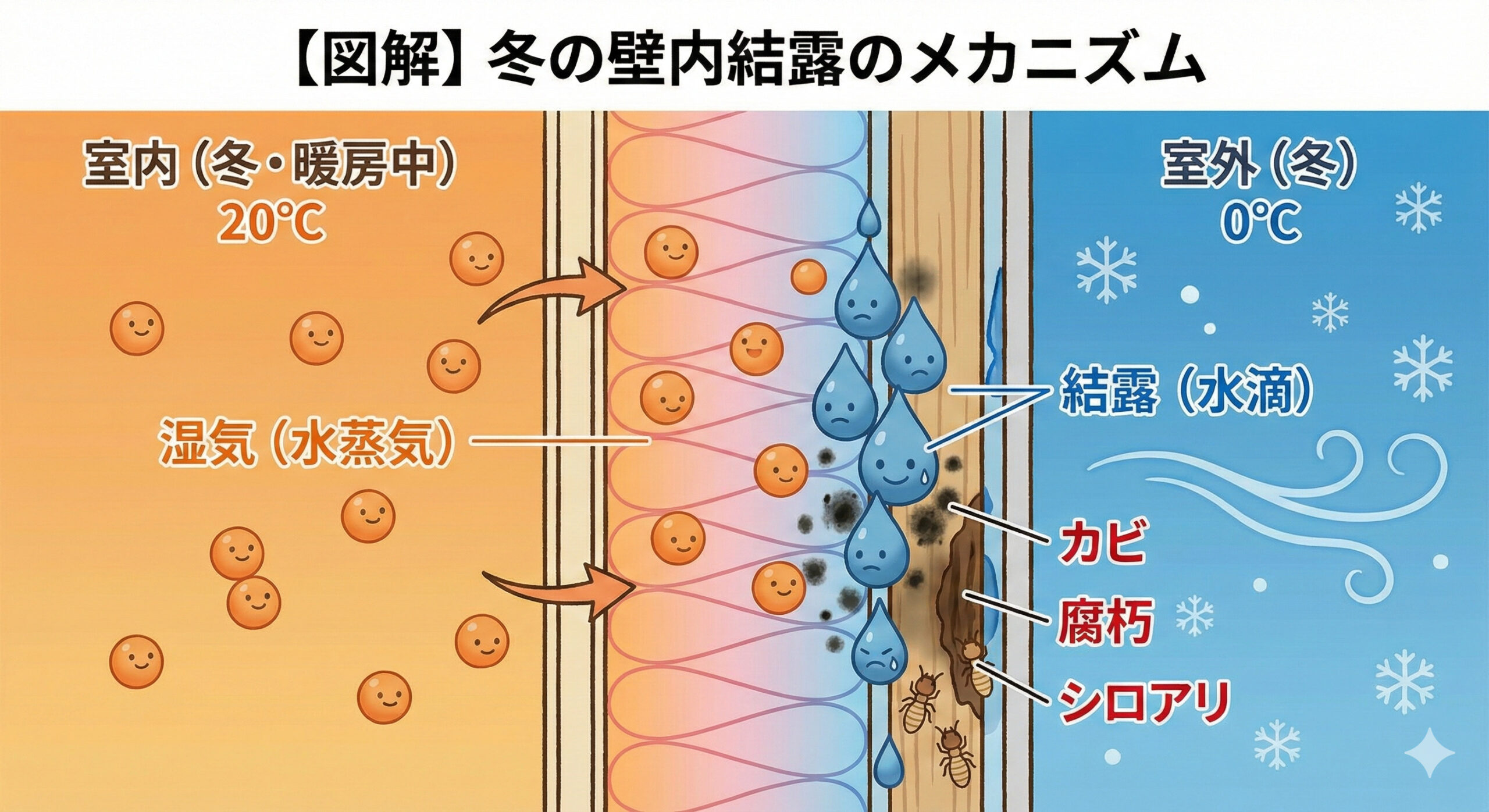 この湿気が壁の中に入り込み、冷たい外気に触れて壁の中で水滴になると、断熱材をカビさせ、柱や土台を腐らせ、最悪の場合はシロアリを呼び寄せてしまいます。🐜🚫