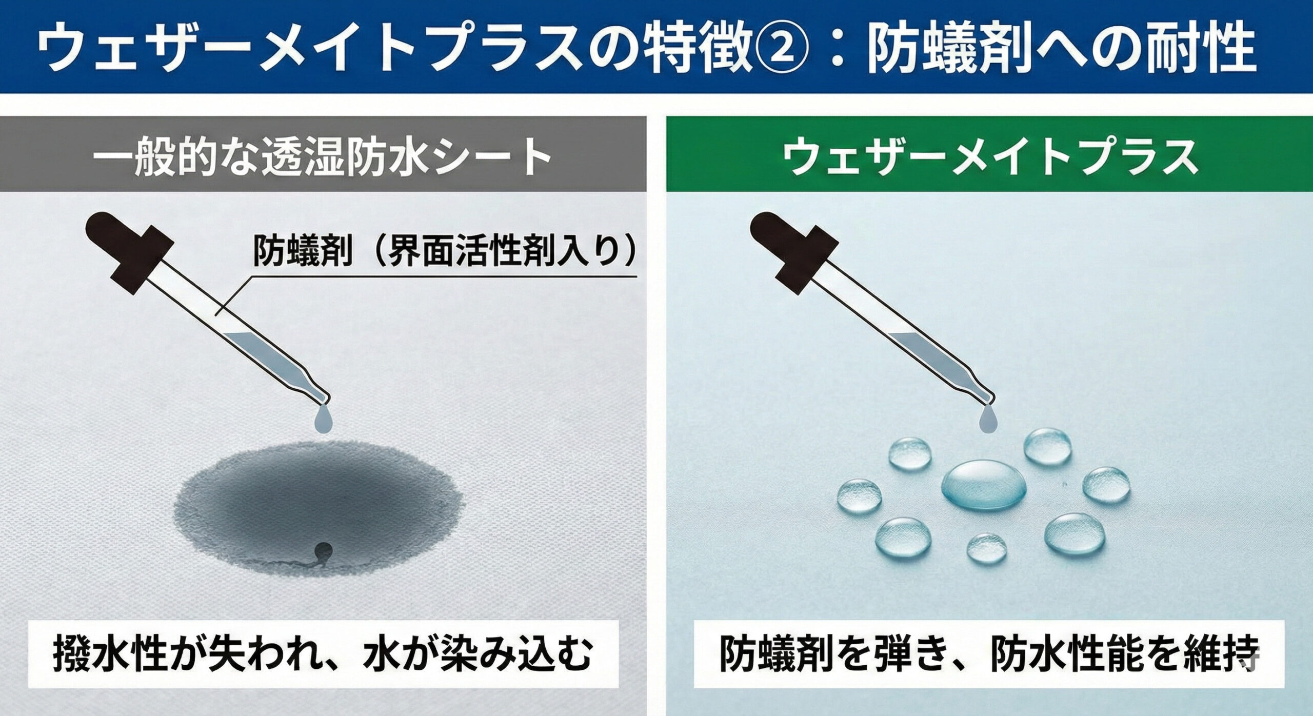 シロアリ駆除に使われる薬剤(防蟻剤)が付着しても、防水性能が低下しない強力な耐性を持っています。将来のメンテナンスを考えた際、非常に重要な安心材料です。