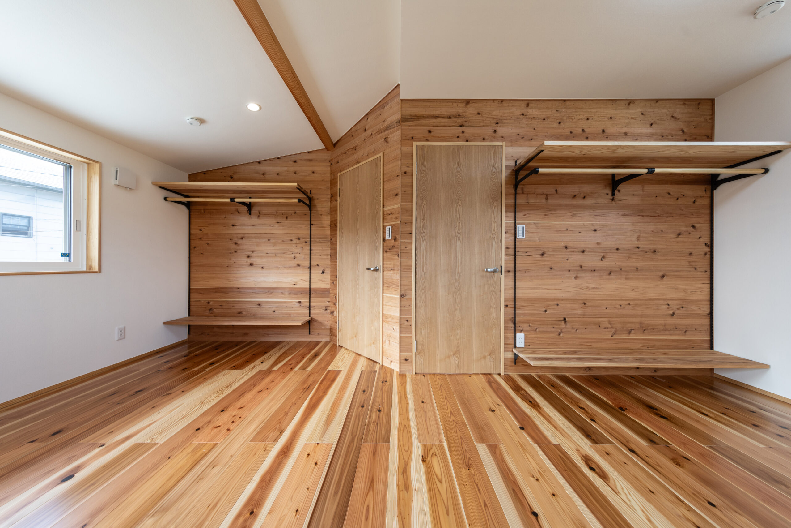 (エコフィールド新築施工事例:節ありのワイルドな仕上がり)