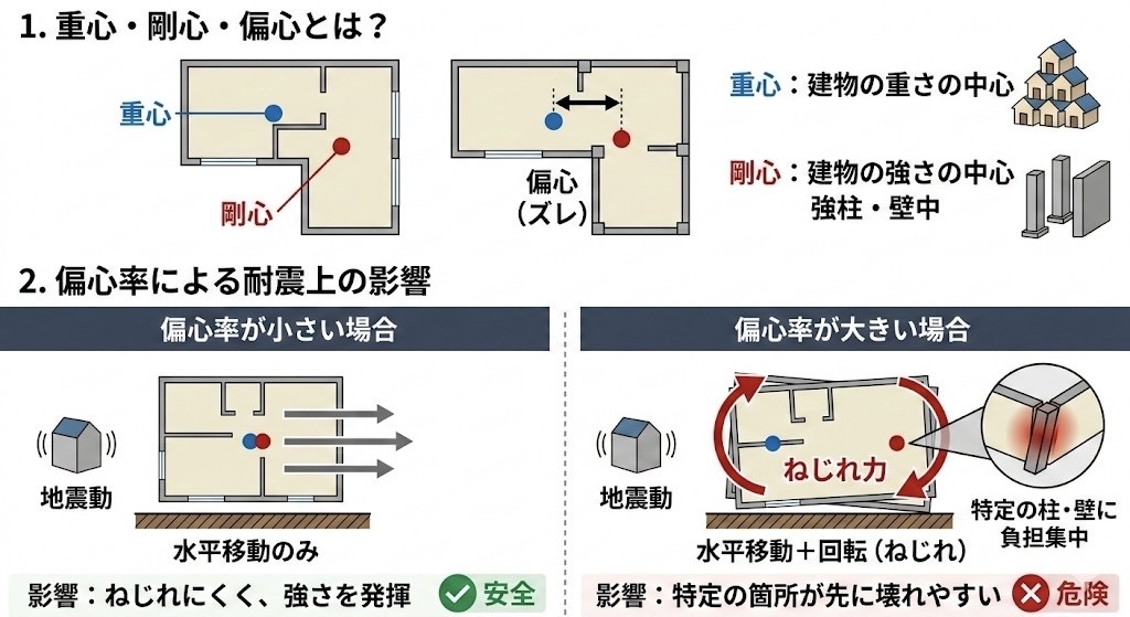 この2つの点が離れているほど、地震が来た時に建物に「ねじれ」が生じ、倒壊のリスクが高まります。
