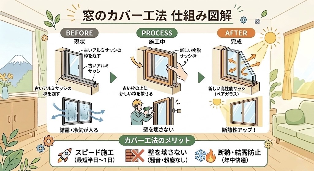 壁を壊さずに済むため、1窓あたり数時間〜半日で完了します。