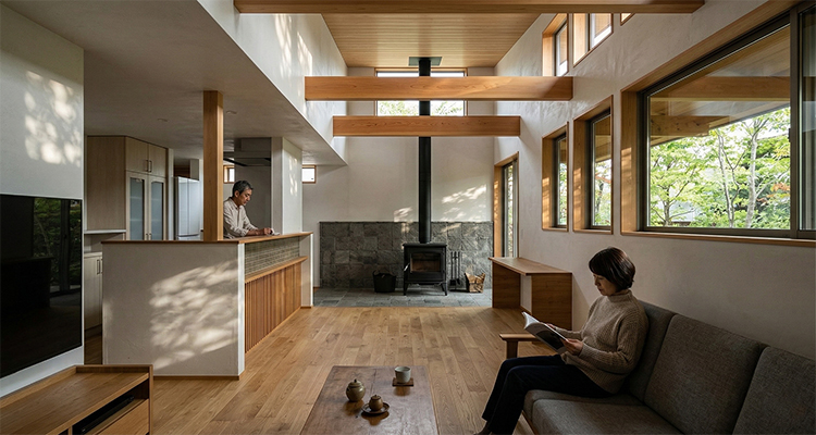 リビングからも2階からも至福の楽しみ。薪ストーブが引き締める空間の表情。