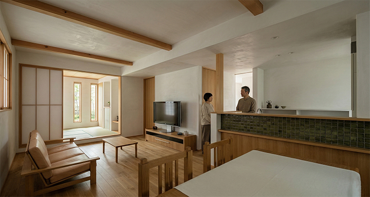 リビング横の小上がり和室は、客間にも、家族の団らんの場所としても活用できる、落ち着きのある空間。