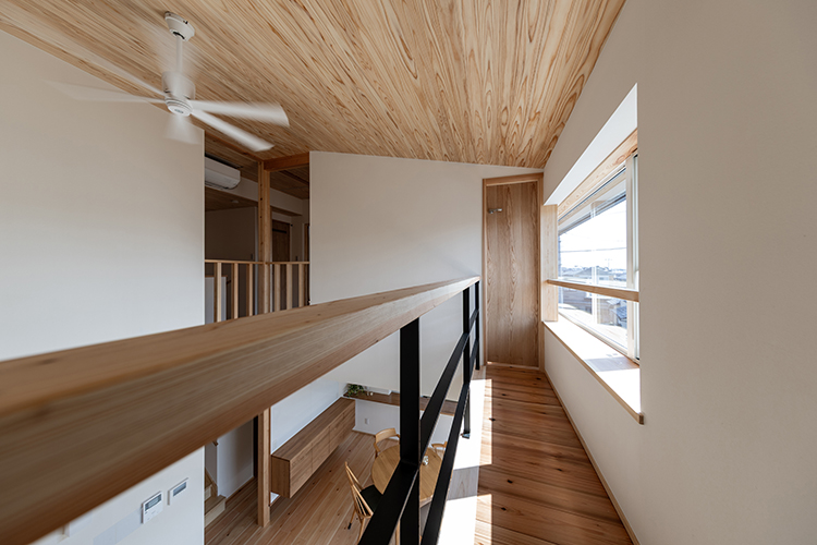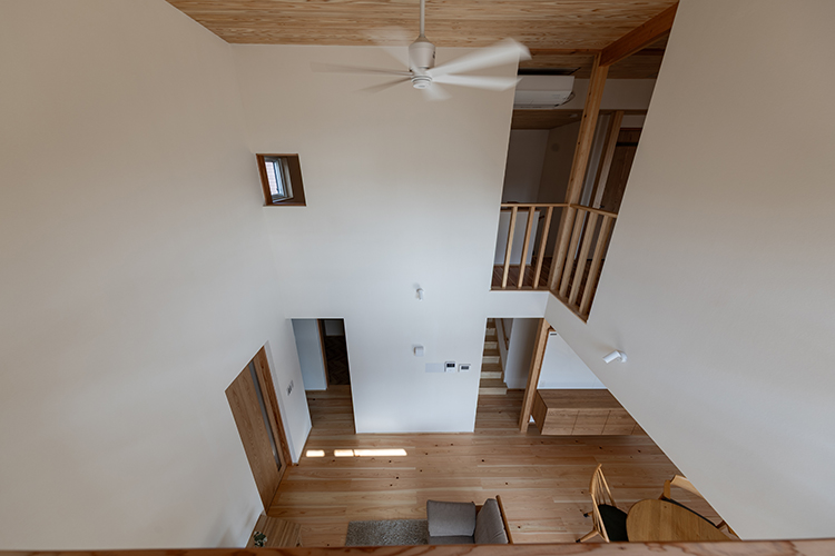 シーリングファンで階下に温冷風を送ります。2Fの小窓は空気の循環のために設けています。