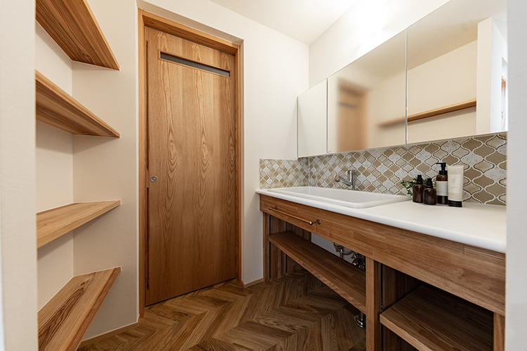 玄関を上がると、汚れて帰宅するキッズ専用ロッカースペース。そのまま洗面脱衣所へ直行できるルートが完成しています。